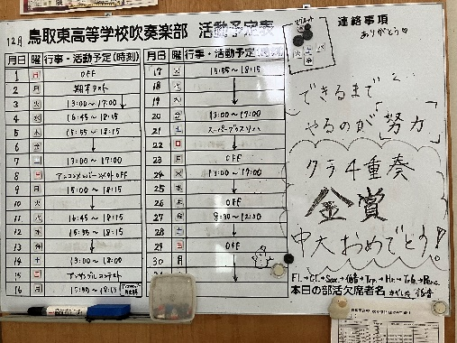 2024年12月23日 10時56分第47回全日本アンサンブルコンテスト鳥取県大会において、クラリネット四重奏のチームが「金賞」を受賞し、中国大会への出場権を獲得しました。